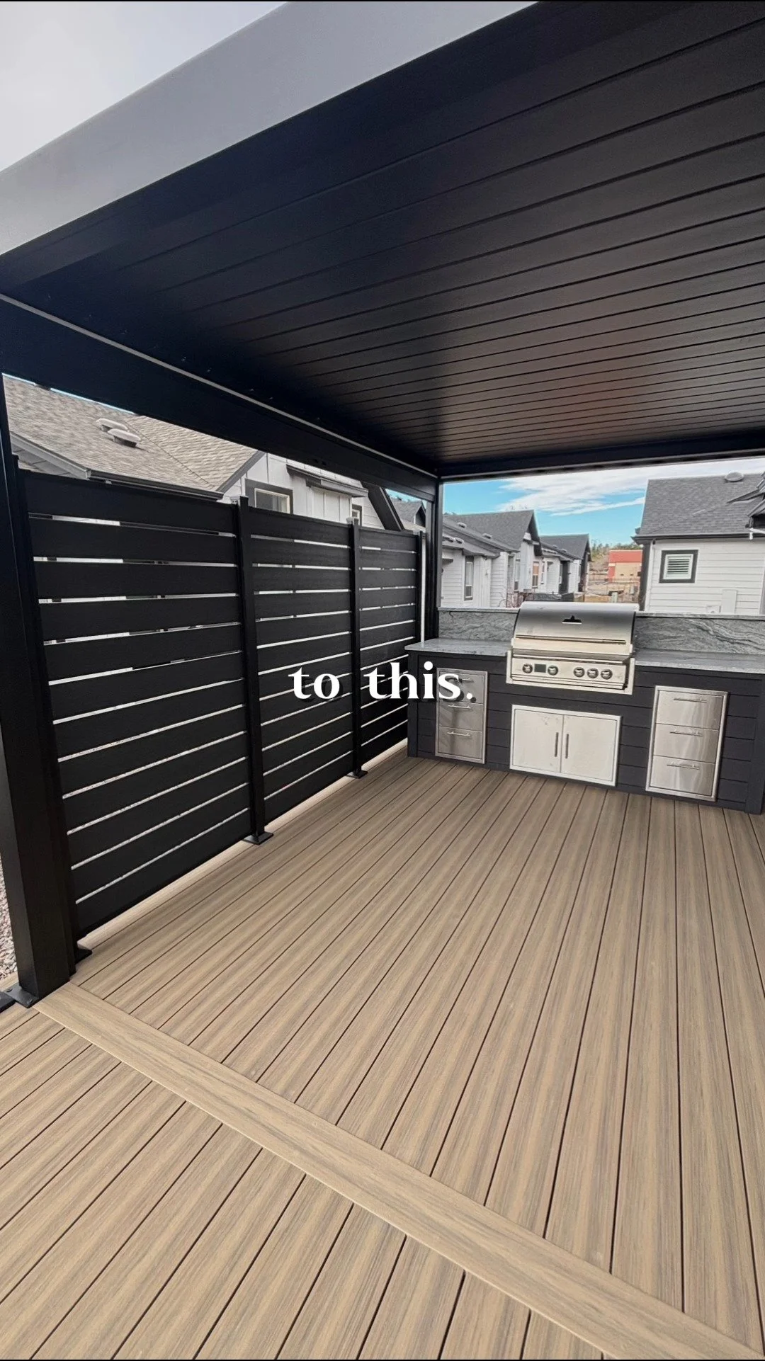 We took a functional but dated deck and transformed it into a luxurious outdoor living room designed for year-round comfort. This new space features a relaxing spa, a built-in grill top and bar, a cozy fire pit area, integrated infrared heaters, and a stylish privacy wall—all under a custom roof cover with skylights.